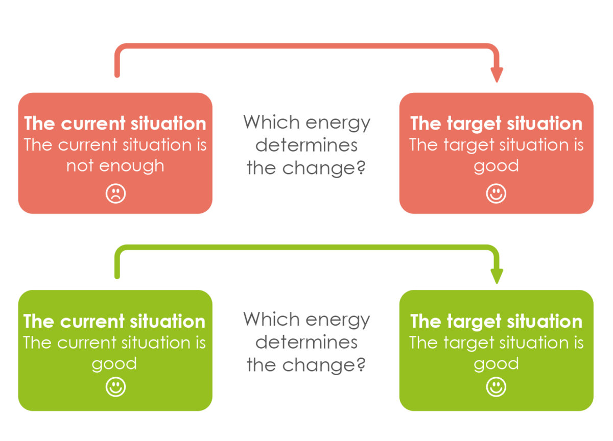 Change comes about much more easily when we build on strengths. What is currently good? What has put us in a position where we have the freedom to influence our own destiny? When we make contact with people in this way, we are much more willing to think about change. Accordingly, we apply the lower, green part of the graphic to our transformation processes.